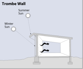A trombe wall is basically a sun facing wall that can easily absorb the suns solar rays and apply them into your home for a comfortable heat. It was actually first invented by a French architect in 1964, but the basic idea was used back in ancient times when adobe blocks were used to build huts and keep the heat within the blocks and slowly release them during the night. Usually, if in the northern hemisphere, the wall is a south facing wall that is between 4 and 16 inches thick. This system is great due to the fact it does all of this heat transference passively and requires barely any maintenance, they reduce heating bills, and are relatively simple to install into your own home.